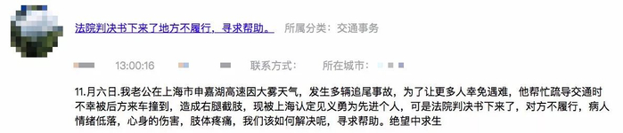 2017年11月6日,上海市申嘉湖高速因大雾天气,发生多辆追尾事故,我老公为了让更多人幸免遇难,帮忙疏导交通时不幸被后方来车撞到,造成右腿截肢。现被上海认定见义勇为先进个人,可是法院判决书下来后,对方不履行。病人情绪低落,身心的伤害、肢体疼痛,寻求帮助。我们该如何解决呢?