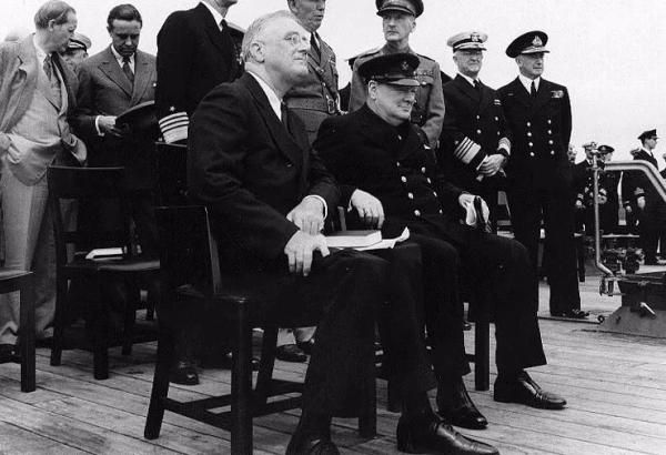 *罗斯福与丘吉尔在签订《大西洋宪章》的军舰上合影