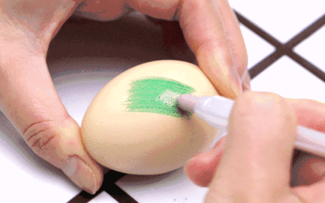 拿彩色铅笔涂画在蛋壳表面,再演示去渍笔效果