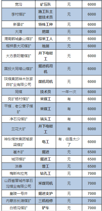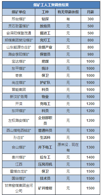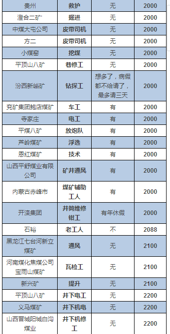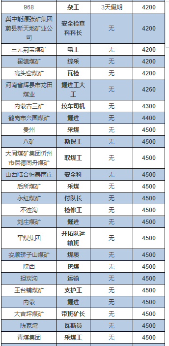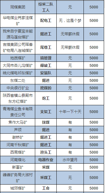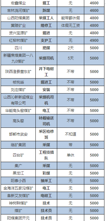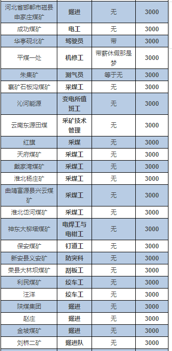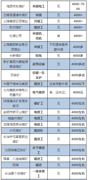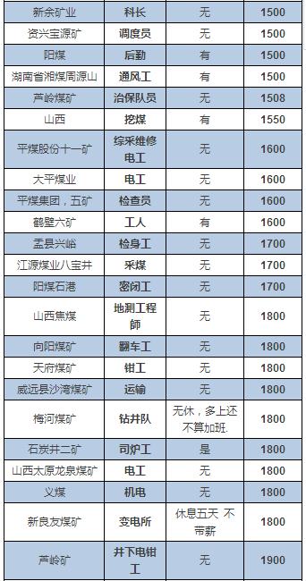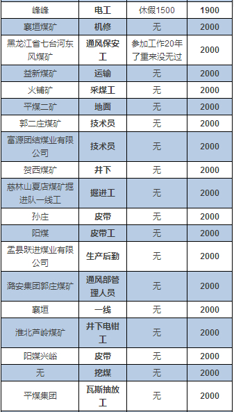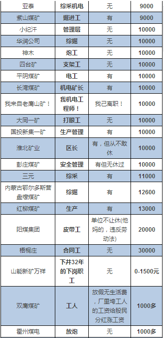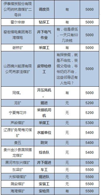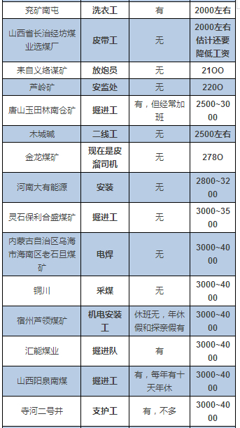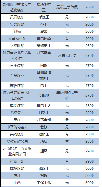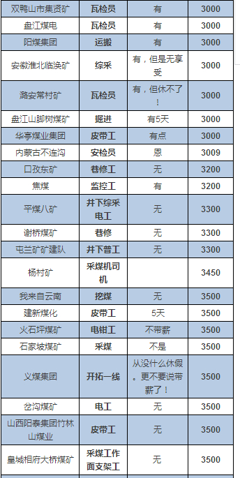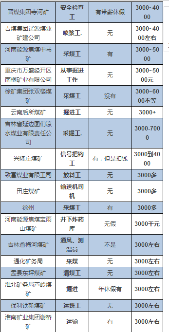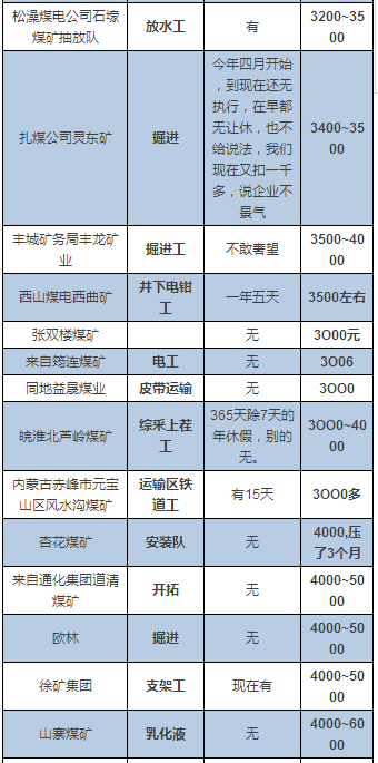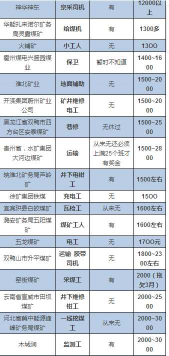 以下图表,是华夏能源网摘取的不同煤矿不同工种的矿工工资情况。