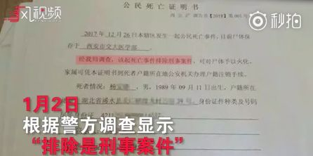 据该报道,西安交通大学药理学博士生杨宝德于2017年12月25日溺水身亡,警方认定,无证据表明系刑事案件。