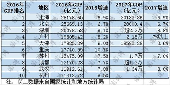 从经济增速来看,2016年,在全国经济面临较大压力的情况下,十强城市的GDP增速全部跑赢或持平全国平均水平。但在2017年,有地方未达全国平均线:北京经济增速为6.7%,低于全国0.2个百分点;天津实现3.6%的增速,低于全国3.3个百分点。