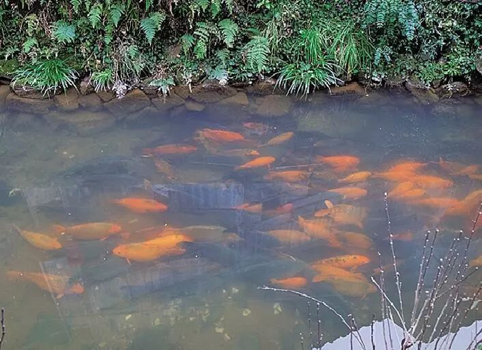 人鱼同乐一进浦源村村口,便见一条潺潺小溪。溪水略显湍急,但仍可见成群结队、五彩缤纷的鲤鱼在溪中怡然自得地游来游去,尽显“主人翁姿态”。