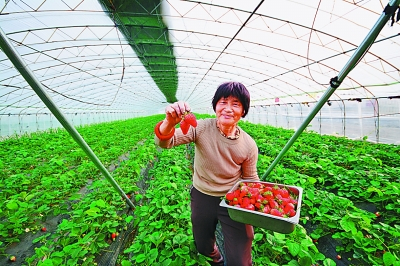 青岛西海岸南辛庄建立草莓产销企业,通过发展电商,引进淘宝小店,带动了全村草莓产业的壮大提升。图为村民王芮菊在采摘草莓。刘莉摄/光明图片