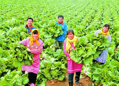 青岛胶州市的菜农在蔬菜产业扶贫基地收获大白菜。王昭脉摄/光明图片