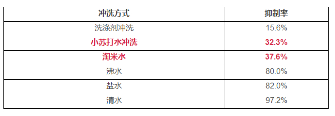 盐水、淘米水、小苏打水清洗后,农药残留抑制率分别为82.0%、37.6%、32.3%,意味着淘米水和小苏打水相对更靠谱。