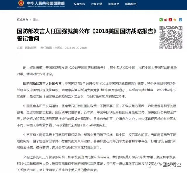 中国国防部发言人任国强就美公布《2018美国国防战略报告》答记者问时说,这份报告借规划美国防务战略妄议中国军队现代化建设,罔顾事实渲染所谓大国竞争 和“中国军事威胁”,充斥着“零和”博弈、对立对抗等不实论断,是继美国《国家安全战略报告》之后又一“冷战”色彩极浓的报告文件。