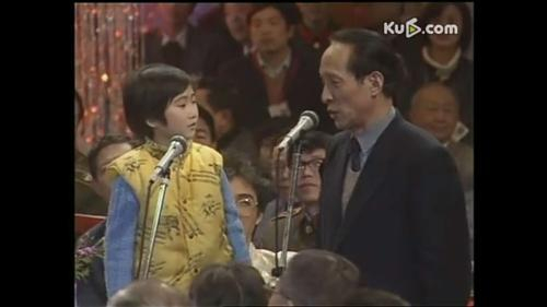 一老一少说相声。老的58岁,刚被评为“全国十大笑星”,小的6岁,奶声奶气刚站得稳。