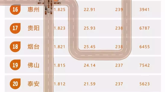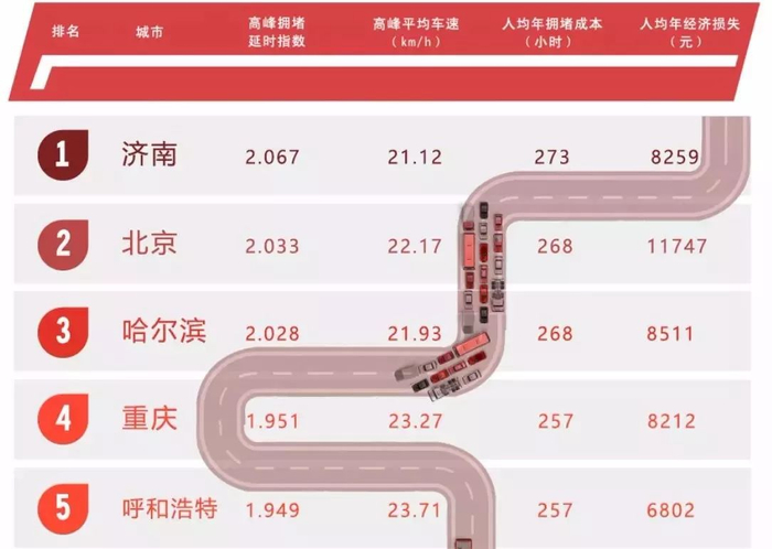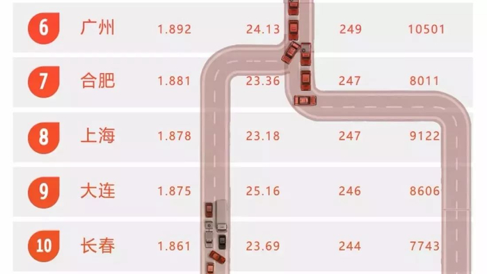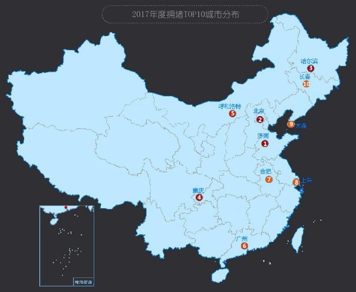 年度堵城第一归属济南,高峰拥堵延时指数2.067,平均车速21.12公里/小时。重庆排名与2016年持平;呼和浩特、合肥、长春首次进入年度TOP10。