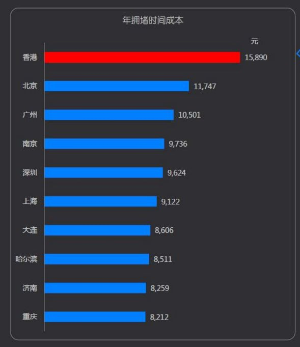 香港:拥堵成本最高城市,2017年拥堵成本15890元,远远高于排在堵城榜第二位和第三位的北京、广州的11747元和10501元。