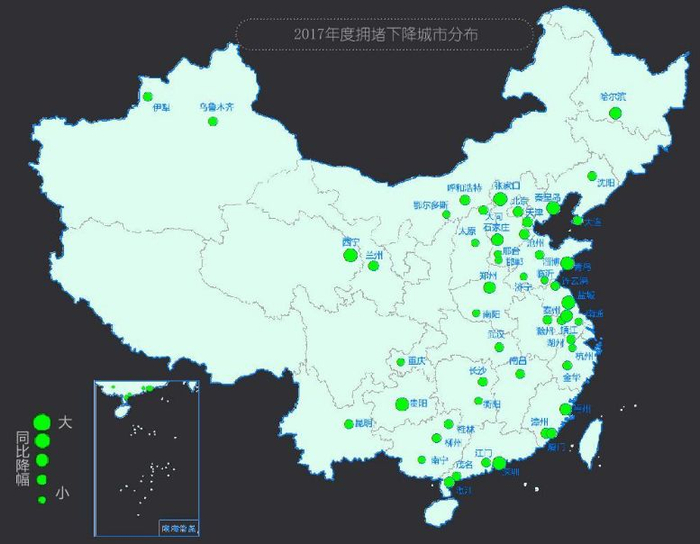 同比2016年,有51%的城市拥堵下降,27%的城市拥堵基本与去年持平,22%的城市拥堵出现上涨。