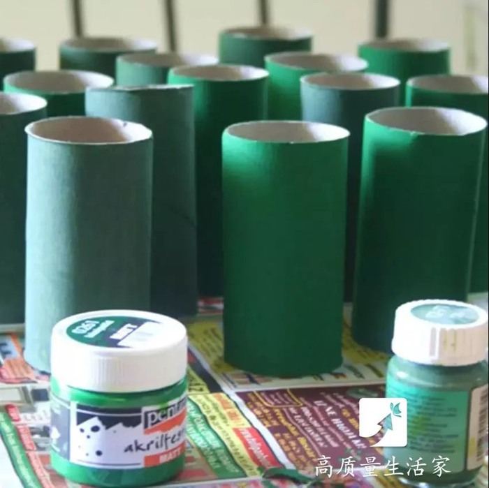 将卷纸芯重新涂颜色后,粘在一块木板或者纸片上加固,就可以做成一个简便式笔筒,办公用笔什么的都可以放。