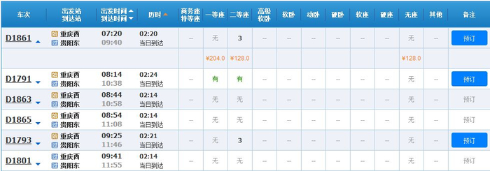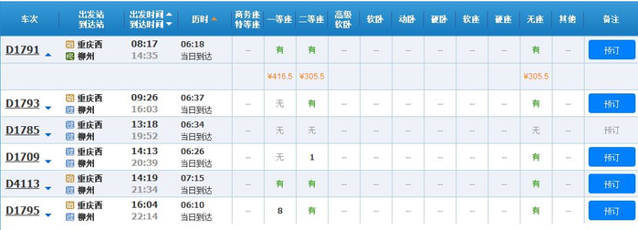 动车:一等座521.5元、二等座392.5元(经渝贵铁路)