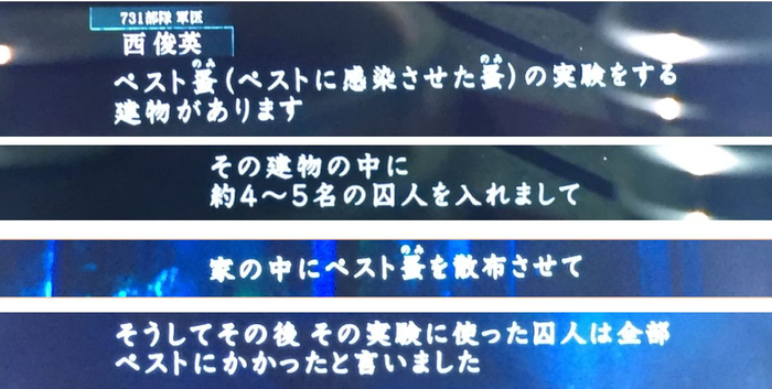原军医西俊英证实说,当时731部队驻地有专门进行鼠疫实验的场所,把4至5名囚犯关进房间,散布鼠疫病菌让他们全部感染。