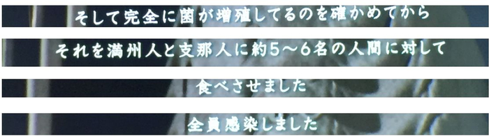 原卫生兵古都作为证人在法庭上讲述了实验过程。古都说,首先把伤寒细菌注入西瓜、真桑瓜等瓜类,在实验室观察细菌繁殖,确认完全繁殖成功之后,让“满洲人”和“支那人”吃下这些水果,最后全部感染细菌。