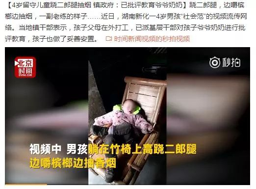 ❂ 4岁留守儿童跷二郎腿抽烟 镇政府:已批评教育爷爷奶奶跷二郎腿,边嚼槟榔边抽烟,一副老练的样子……近日,湖南新化一4岁男孩“社会范”的视频流传网络。当地镇干部表示,孩子父母在外打工,已派基层干部对孩子爷爷奶奶进行批评教育,孩子也做了妥善安置。