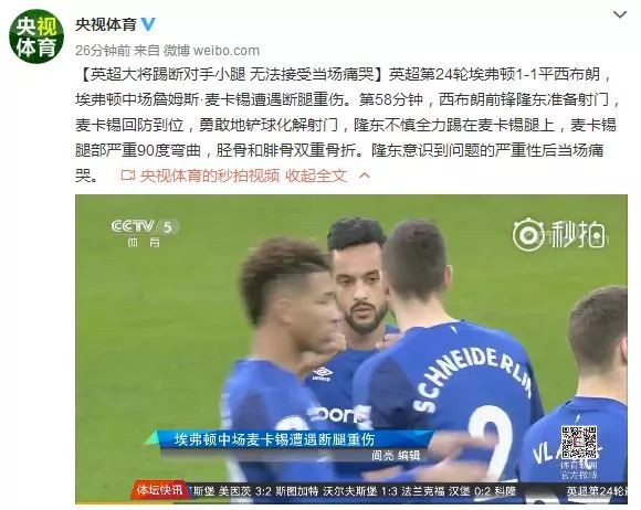 ❂ 英超大将踢断对手小腿 无法接受当场痛哭英超第24轮埃弗顿1-1平西布朗,埃弗顿中场詹姆斯·麦卡锡遭遇断腿重伤。第58分钟,西布朗前锋隆东准备射门,麦卡锡回防到位,勇敢地铲球化解射门,隆东不慎全力踢在麦卡锡腿上,麦卡锡腿部严重90度弯曲,胫骨和腓骨双重骨折。隆东意识到问题的严重性后当场痛哭。
