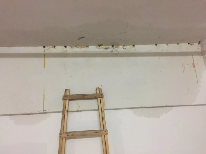 21日下午,记者来到该商铺二楼发现,屋顶确实有几处已经霉变,颜色发黑。另外,屋顶及墙面还有几处出现渗水的情况。记者又走访了该电器店隔壁的同排商铺,发现其他商铺并未出现墙体渗水情况。
