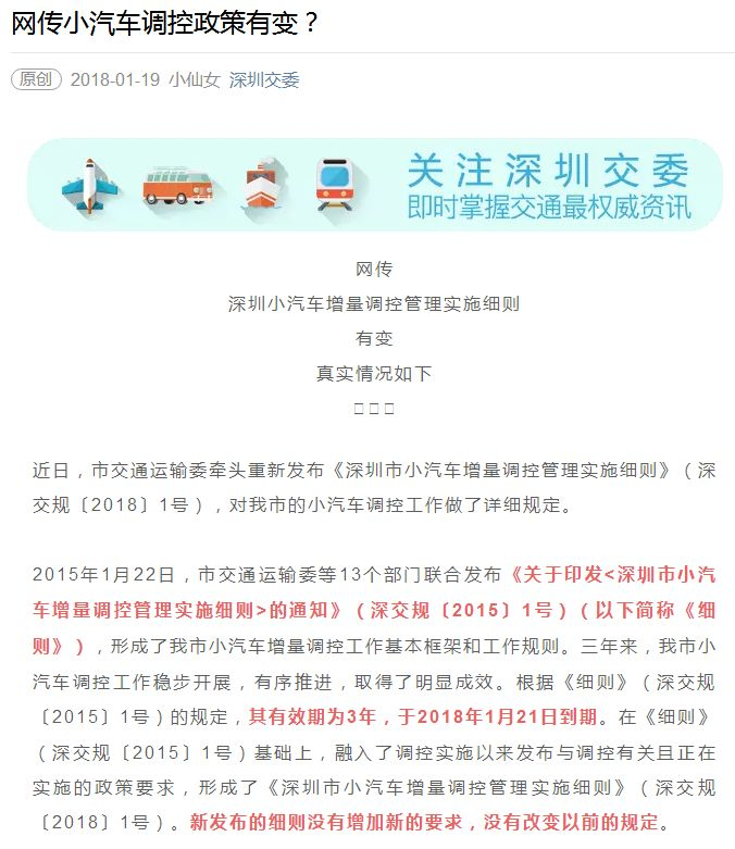 1月19日晚,深圳市交通运输委就通过官方微信公众号作出回应:该信息纯属误传。深圳市交委已牵头重新发布《深圳市小汽车增量调控管理实施细则》(深交规〔2018〕1号),对深圳的小汽车调控工作做了详细规定,与2015年1月制定的细则基本无异。