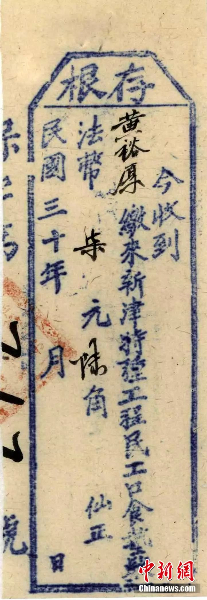 1941年修建新津机场民工黄裕厚自带伙食款法币7元6角的垫支收据 成都市档案馆供图