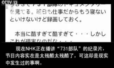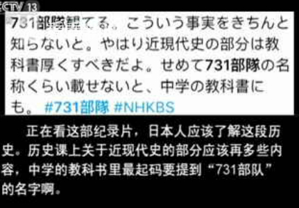 “现在NHK正在播讲‘731部队’的纪录片,节目内容实在是太残酷。可这却是现实中发生过的事啊。”
