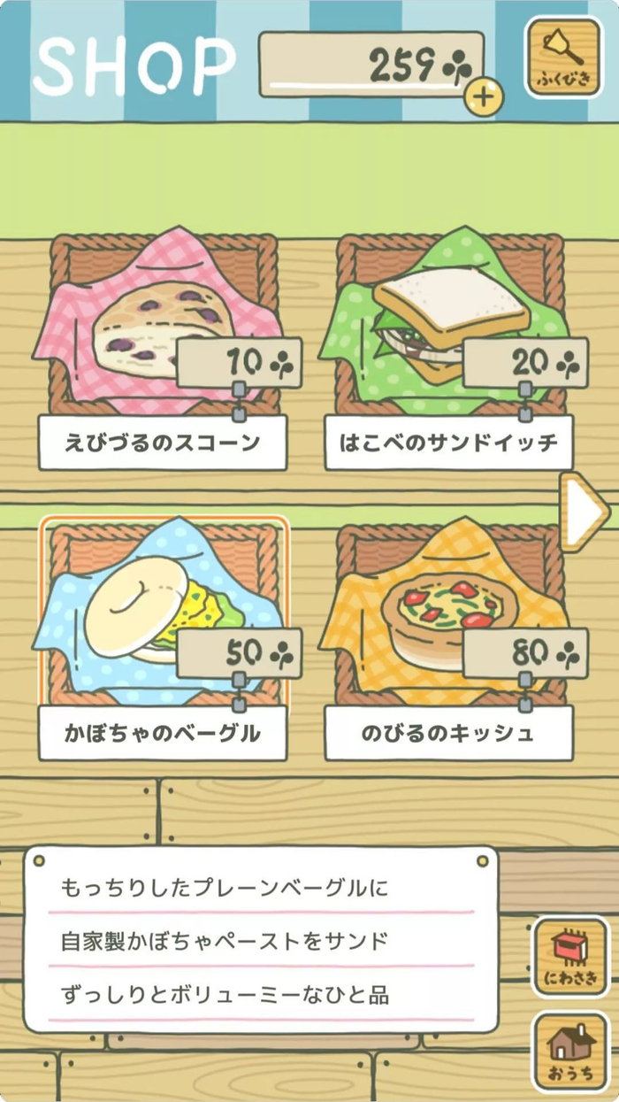 如图所示我的幸运草还很少不过我会继续努力采摘的!不管怎样,先看下商店里有卖的都是些啥吃的。