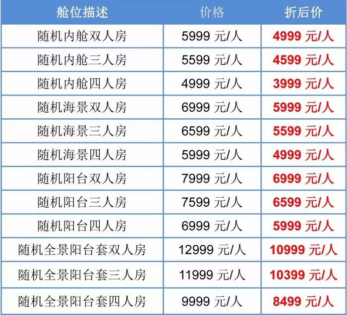 5、单房差:每间舱需达到最少入住人数,不满2人需要补单房差船票的150%;