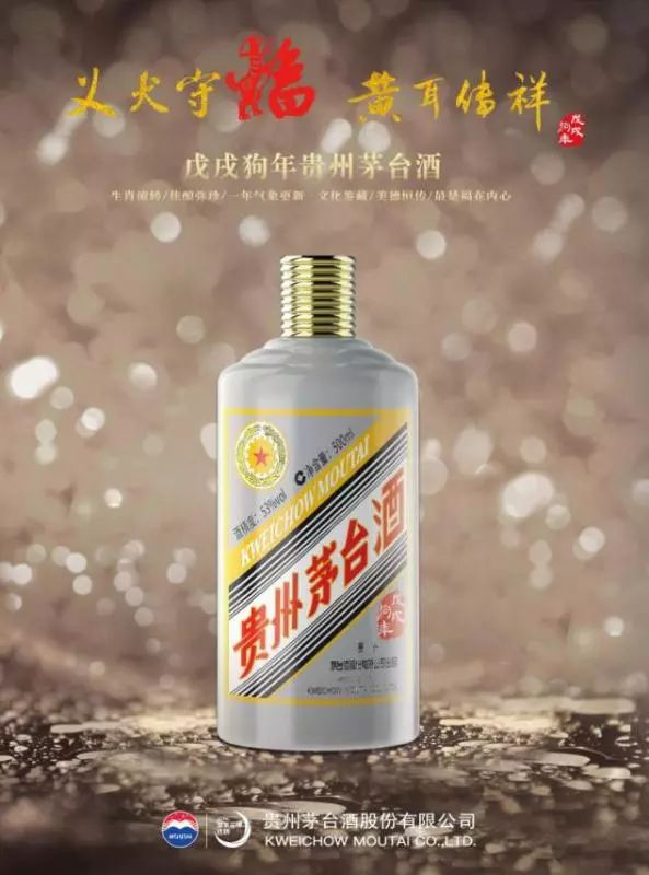 据悉,戊戌狗年贵州茅台洒集生肖文化、五行文化、国画艺术等文化元素为一体,结合茅台酒传统包装风格,继续传承马羊猴鸡的包装风格及理念进行设计。