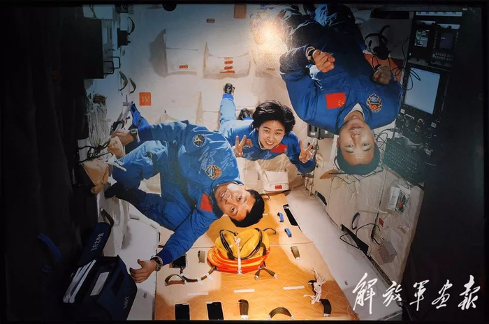 “三人行” 执行神舟九号与天宫一号飞行任务的三位航天员在天宫一号舱内合影。(提供/景海鹏 刘旺 刘洋)