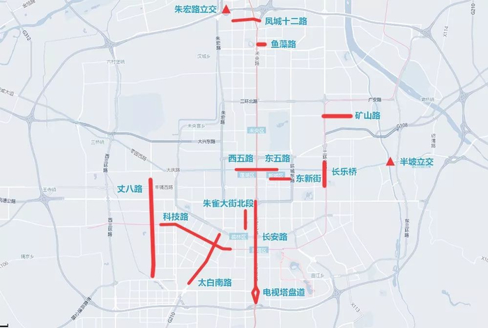 太白立交双向掉头处、朱雀桥向西、长安立交向东、太乙路立交双向掉头处、和平门隧道出入口、长安路西安宾馆向南、高新十字向西掉头处、小雁塔十字南北双向、六村堡立交、朱宏路立交、石化大道、快速干道、西南二环桥上、210国道、环山路、雁引路、108国道、明光路七路十字到九路十字、鱼藻路、市政府南门、凤城十二路、凤城十一路、雁翔路、大唐不夜城、东新街、西五路、东五路、太华路、矿山路、长乐桥、咸宁桥、互助路盘道、太白南路、科技路、锦业二路、电视塔周边、长安路、丈八路、电子西街、电子二路、电子四路、白鹿原、港务大道、半坡立交。
