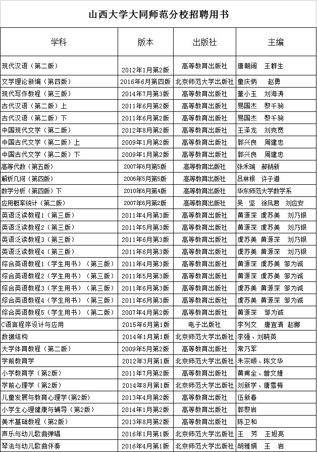 教学能力测试(即专业测试,包括教案编写和试讲试教),以试讲试教为主,每人备课、编写教案时间90分钟,讲课时间20分钟,教材使用大同大学大同师范分校2017年度现行教材(详见附件3)。