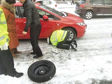 1月23日,交警跪雪地帮群众换轮胎的照片得到了众多网友点ZAN。记者获悉,1月23日,临城降雪,10时20分许,冒雪在县城文化街与临泉路交叉口执勤的交警冯夺,发现一辆红色轿车右前轮爆胎,便帮忙将车推到路边安全地带。冯夺看到该车女司机不会换备胎时,没有多想,便跪在雪地上帮她卸轮胎、装轮胎,在同事的帮助下,轮胎很快就更换完毕。这一幕被过往群众看到并拍照发到网上,引来众多网友纷纷点ZAN。(燕赵都市报)