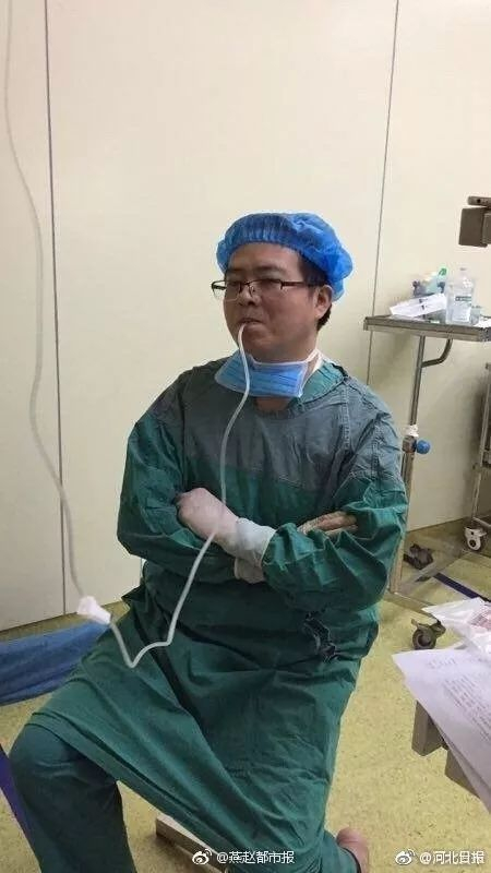 1月20日,石家庄市栾城人民医院曹靖有三台手术连台,由于长时间站立及精神高度集中,做完手术后人也累虚脱了... 同事拍下了这一口含输液管进行葡萄糖补液的一幕。冬季病人比较多,每个科室住院病人都爆满,好多科都是这样的情况,患者多医护少,医护人员为了他人的健康全力以赴!(@燕赵都市报)