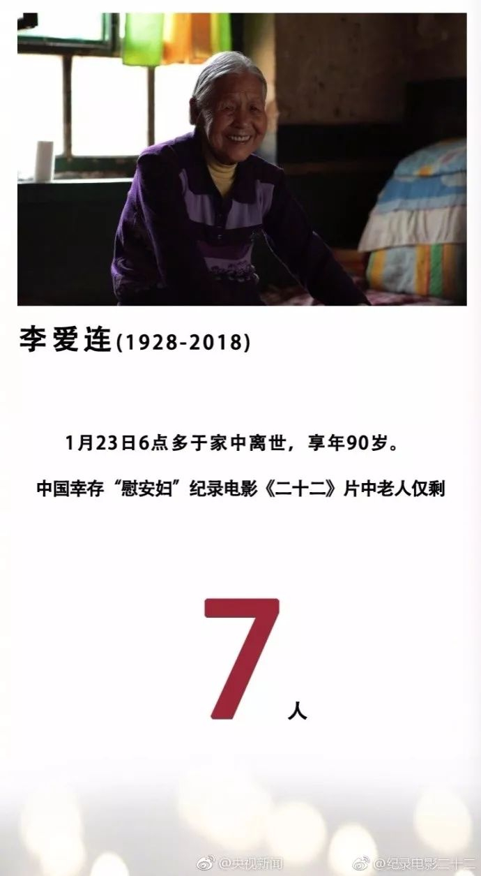 据@侵华日军南京大屠杀遇难同胞纪念馆 ,曾在慰安妇题材影片《二十二》中出现的老人李爱连,于23日早晨在山西家中去世,享年90岁。至此,影片中22位老人仅剩7位在世。血泪不容忘!