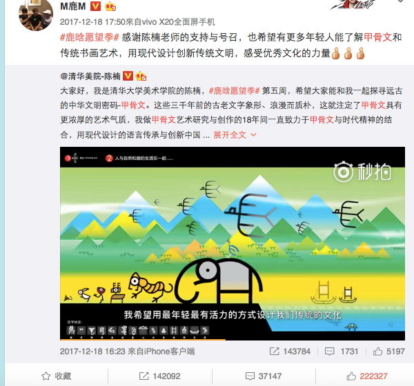 “我设计数字化甲骨文,就是希望赋予古老的汉字以时代气息。”陈楠告诉澎湃新闻记者,他设计的甲骨文字体注重表现现代设计语境,矢量化直线体的字形设计、充满年轻气息的动画视频、嘻哈歌曲……上个月,鹿晗转发了他的微博视频,旋即引发阅读量3100万、转发超过14多万次。
