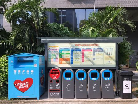 在深圳街头和社区,经常可以看见这样的垃圾箱,将垃圾细分为“玻璃”“金属”“塑料”“纸类”等。