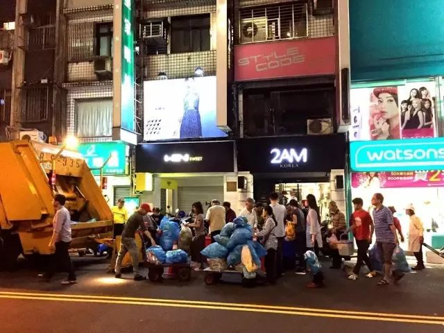 最典型的台北生活场景之一:家中的爸爸妈妈骑着机车,提着垃圾袋,在垃圾车到达时刻,准时开到指定地点,然后消失在夜色的霓虹中