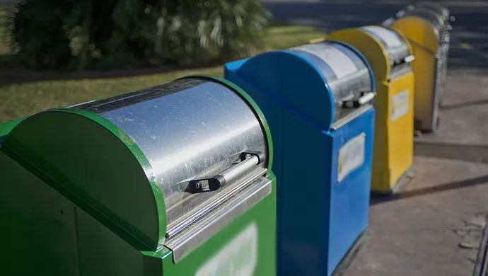 小区正门口整齐地放置着五个颜色各异的垃圾箱:蓝色是可回收物,棕色是湿垃圾,红色是大件干垃圾,绿色是玻璃。