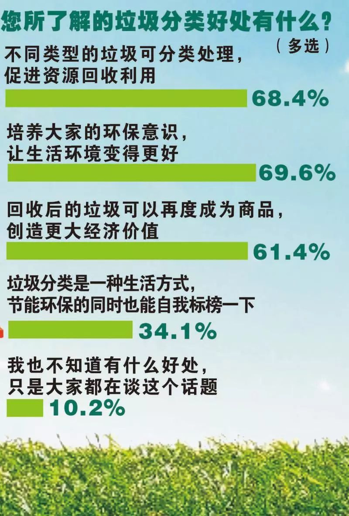 据一项社会调查,近70%的居民认为,垃圾分类的最大好处在于能培养大家的环保意识,使环境变得更好以及促进资源的回收利用。