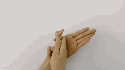 先用右手握住左手大拇指根部,保持大拇指稳定,然后将大拇指上半部分尽量弯曲,有拉伸感为宜。拇指指尖回位。动作重复10次,换另一只手做相同动作。