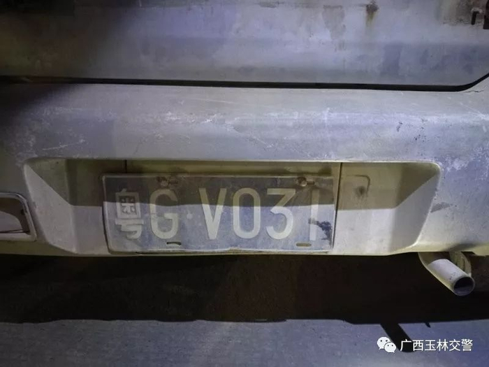 原来,这辆车的前后车牌,都要比常规的短了一小截,少了一个数字。常规车牌号码是五个数字加字母组合,但它只有“粤G-V031”四个,而且边缘不平整,明显是折断的。