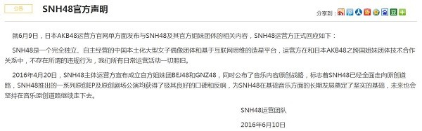 针对日方的除名声明,SNH48发表声明称双方只存在技术合作,不存在违规行为。
