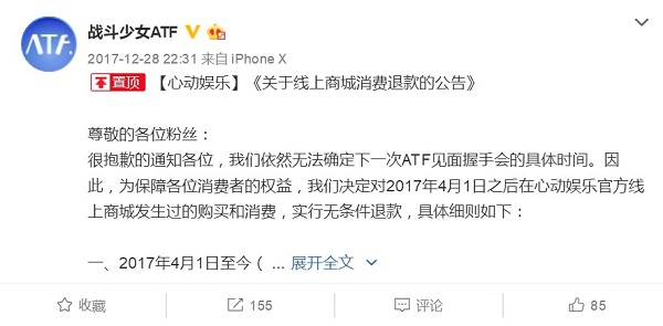 2017年12月28日,音悦台投资的女团战斗少女ATF在停更了六天官博之后,发布了线上商城退款的公告,个中意味不言自明。这个团曾经走进大众视野是在八个月前的音悦台盛典上,ATF被EXO的粉丝视作“抢走”了本属于他们的最受欢迎组合奖,当初如此强势的她们如今恐怕也难逃黯然收场的命运。
