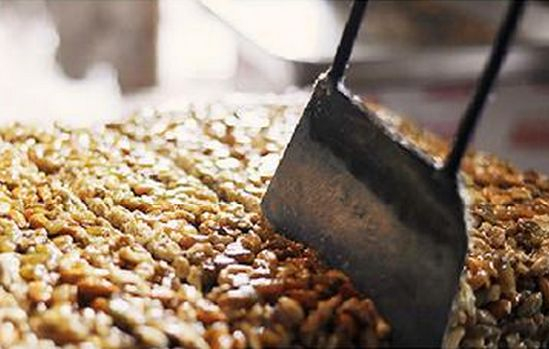 最后,再加入来自新疆天然无污染的莎车巴旦木,纸皮核桃,鹰嘴豆和葡萄干混合而成的杂锦果仁,将果仁完全浸入糖饴,用力搅拌均匀,糖饴和果仁我中有你,你中有我,相辅相成。