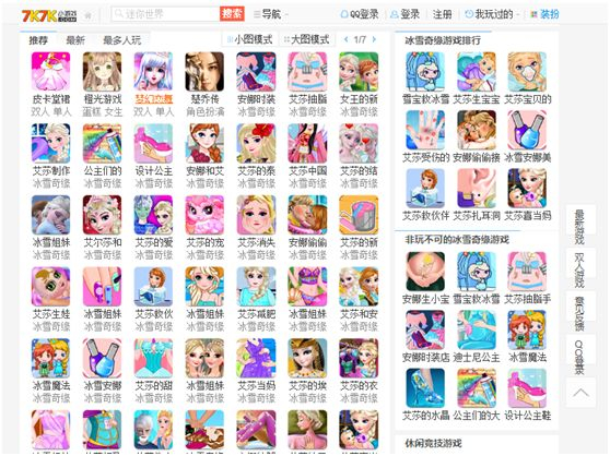 7k7k上冰雪奇缘栏目中的小游戏,其中“非玩不可”的推荐游戏包括“安娜生小宝宝、艾莎油脂手术”等。网络截图