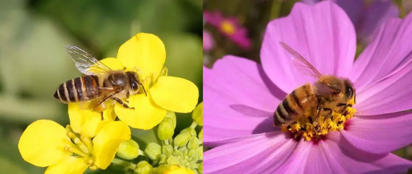 左:中华蜜蜂,右:欧洲蜜蜂(注意腹部的黑色条纹深浅)。图片来源:http://www.insects.jp/kon-hatiyousyumitu.htm