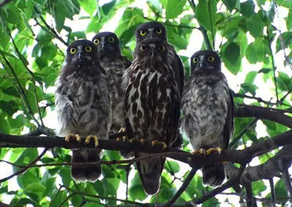 同成鸟相比,一般鹰鸮的幼鸟们才喜欢挤在一起,它们腹部羽毛的纵纹要比爸爸妈妈们模糊不少呢。
