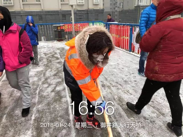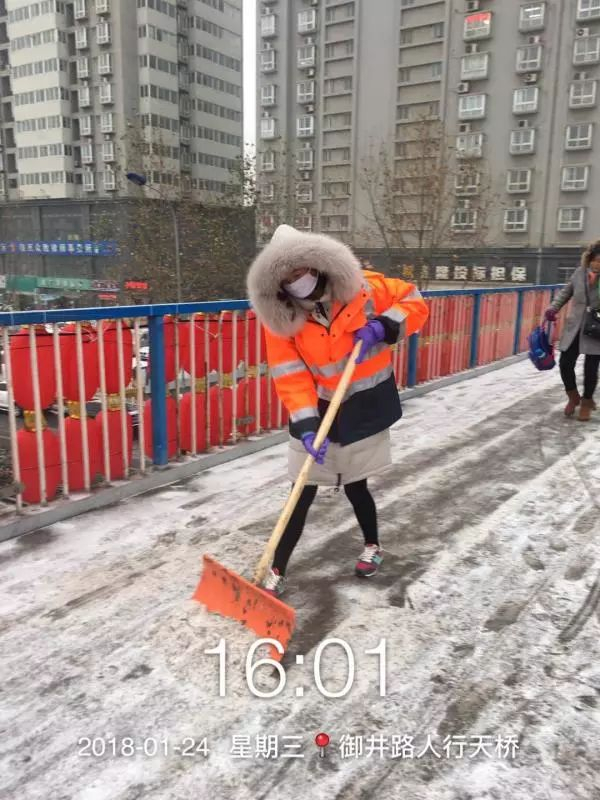 1月24日,古城迎来一场降雪,大雁塔北广场前的天桥上,保洁员即时清理积雪,保障过往行人的安全。