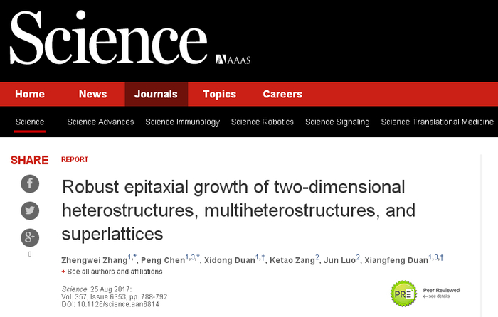 2017年8月,《Science》发表了我校化学化工学院段镶锋特聘教授、段曦东教授为通讯作者的论文《二维异质结、多异质结、超晶格的通用制备》,我校为第一单位,论文第一作者为我校化学化工学院一年级博士生张正伟和博士后陈鹏。同年5月,化学化工学院博士后梅琳等作为共同第一作者(通讯作者为段镶锋教授),在《Science》以article形式发表论文,我校为论文第二单位。