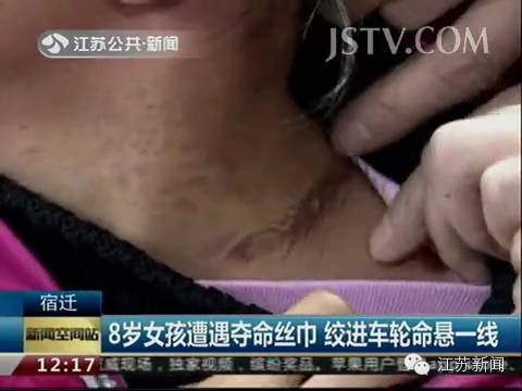 2015年11月,江苏宿迁一个8岁女孩坐妈妈的电动车时,围着的长丝巾两头都被绞进后车轮,脖颈被死死勒在牙盘上,女孩开始脸色发青,舌头伸长,有人用刀割断丝巾时,女孩已经没有呼吸,做了人工呼吸才得救。